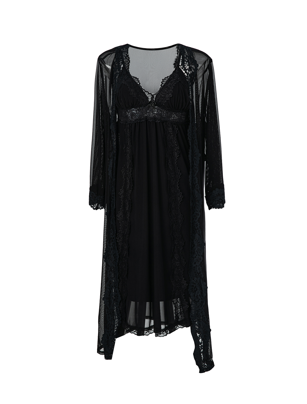 Abito lungo a due capi in tulle elasticizzato nero, dal fascino sensuale e femminile. Il tessuto morbido e leggero avvolge delicatamente la silhouette, richiamando lo stile lingerie in chiave elegante. La composizione a strati crea movimento e trasparenze sofisticate, mentre la vestibilità fluida garantisce comfort e libertà di movimento. Perfetto per chi cerca un look seducente senza rinunciare alla raffinatezza.