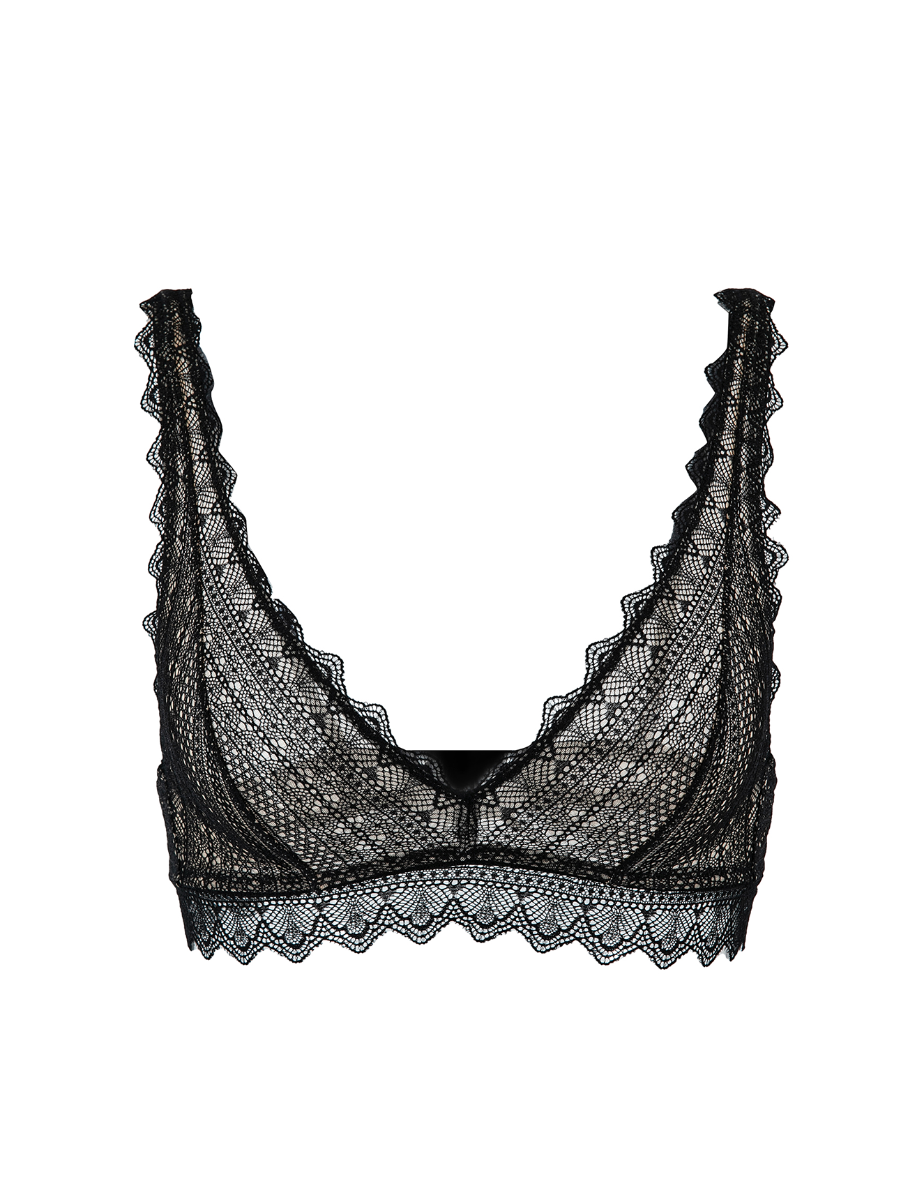 Bralette a triangolo nera senza ferretto in pizzo jacquard italiano, caratterizzata da una scollatura profonda, bordi smerlati e spalline multiposizione per un’eleganza quotidiana e un comfort naturale.
