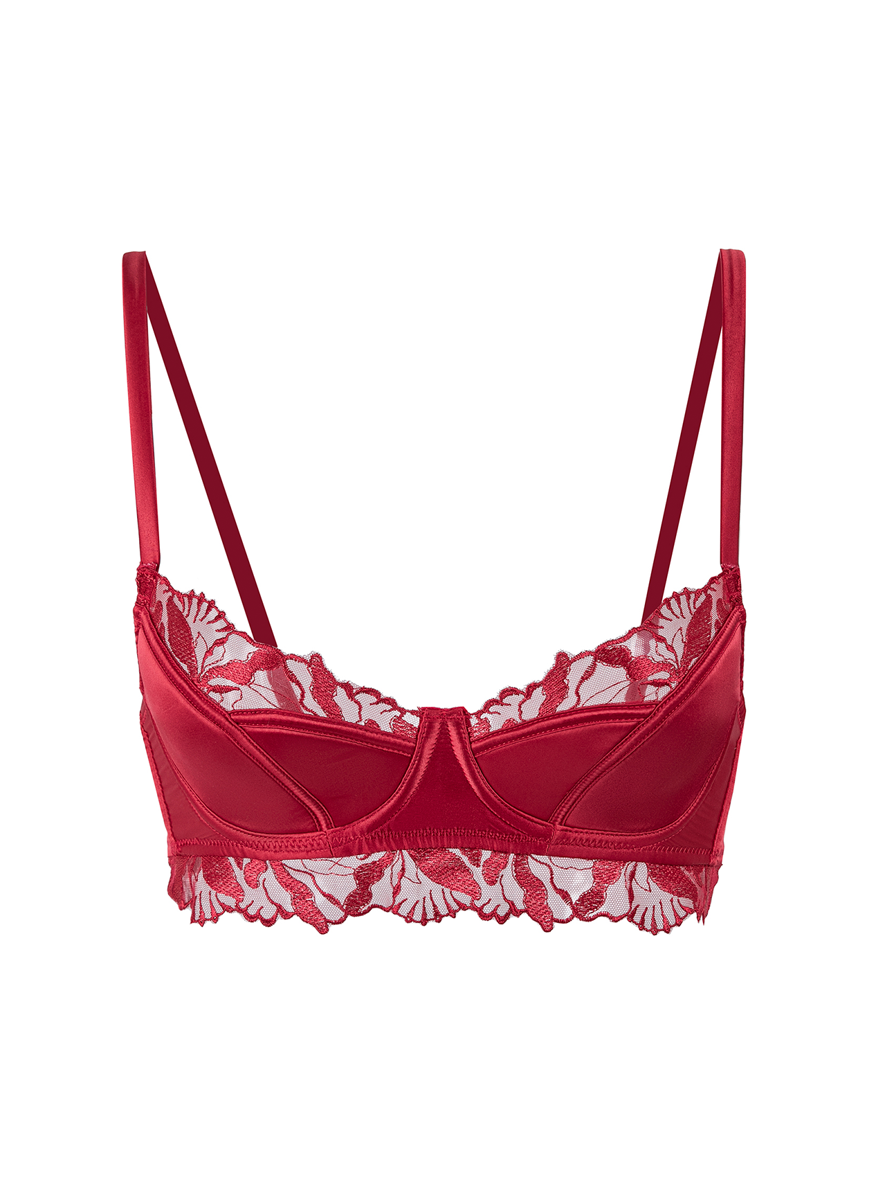 Bralette in raso rosso con raffinati dettagli in pizzo floreale. Un modello che unisce sensualità e comfort, ideale per un look intimo sofisticato o come capo outerwear. Spalline regolabili.