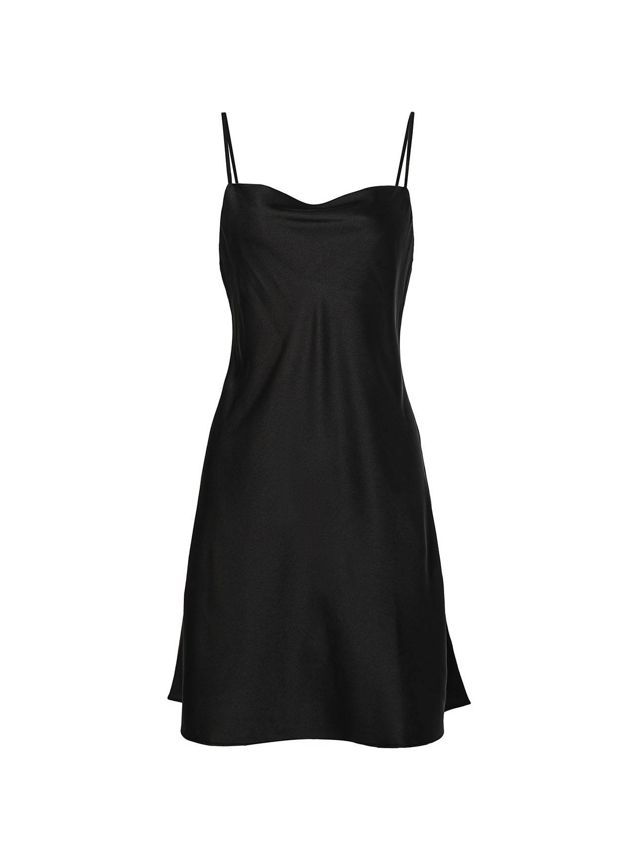 Mini abito sottoveste nero in raso con elegante scollo a cascata e spalline sottili. Un capo versatile e di tendenza, ideale per creare look sofisticati o casual-chic, adatto a diverse occasioni.