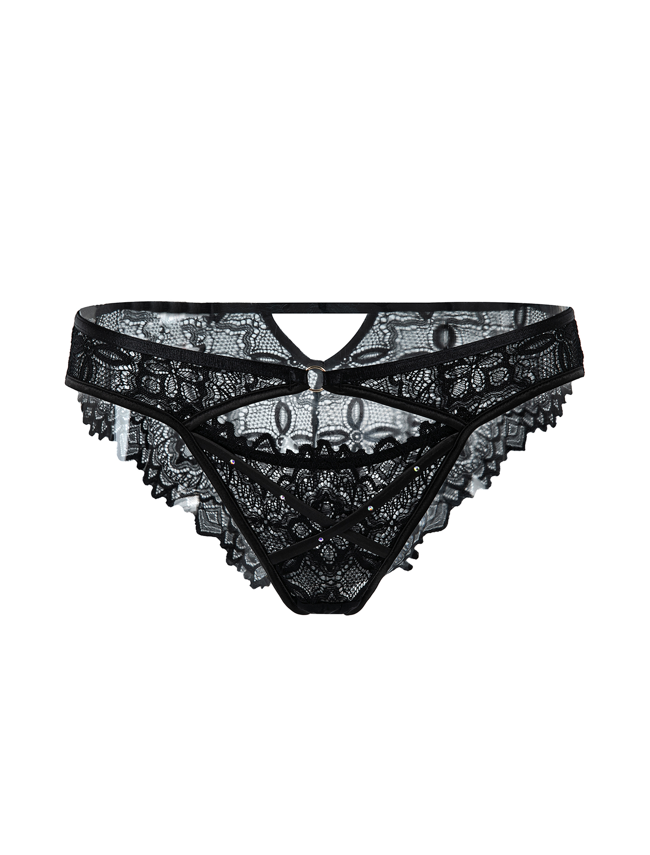 Sofisticato perizoma a vita alta in pizzo nero con audaci cut-out e dettagli in rete. Caratterizzato da un anello decorativo centrale e strass scintillanti per un look seducente.