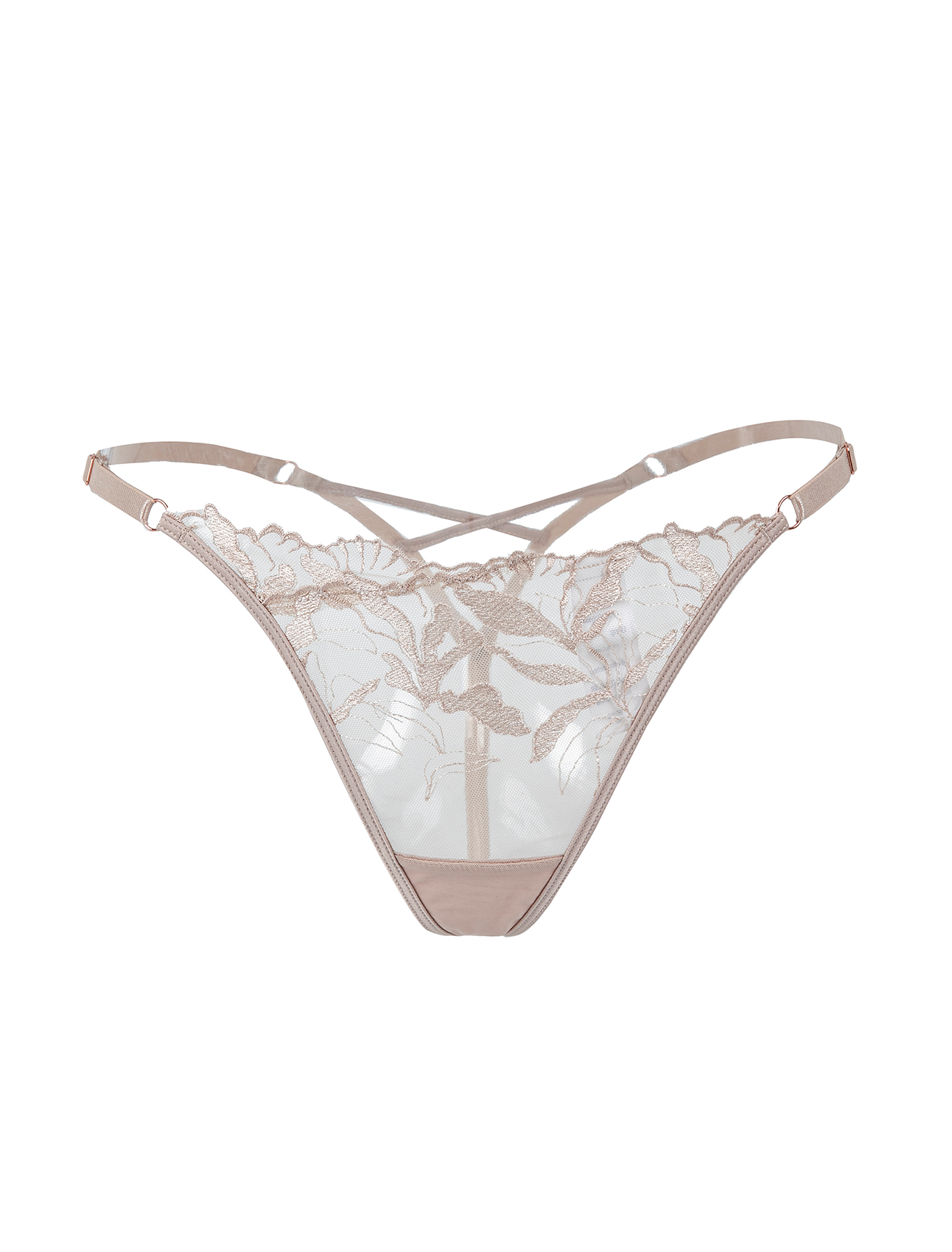 Perizoma rosa a vita bassa con raffinato ricamo floreale in pizzo su tulle trasparente e audaci cinturini elastici incrociati lucidi effetto “wetlook”.