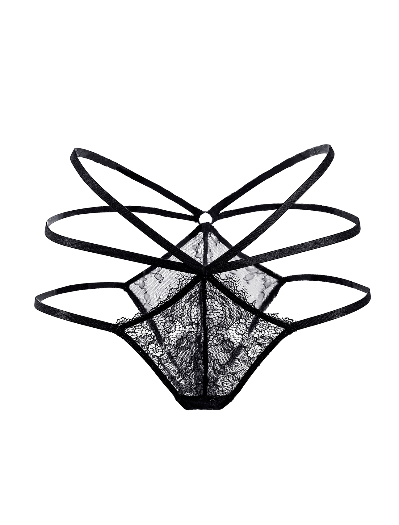Perizoma in pizzo nero con design a spalline incrociate e anello centrale, che offre un look audace e sofisticato. Realizzato con tessuto trasparente e cinghie elastiche per una vestibilità provocante.