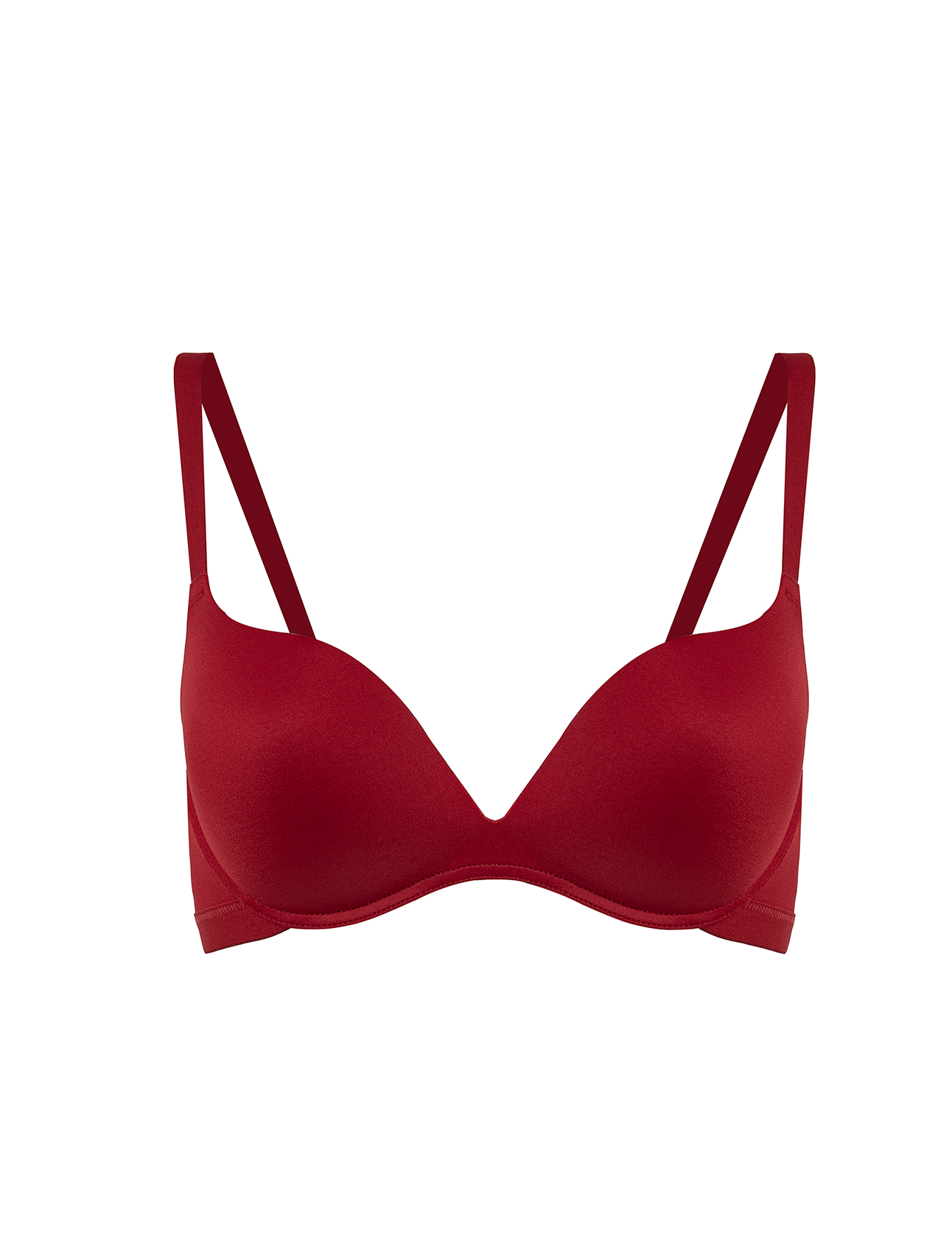 Reggiseno push-up in microfibra liscio e senza cuciture, color rosso. Offre un sollevamento naturale e discrezione totale sotto i vestiti più attillati. Massima comodità e vestibilità effetto “seconda pelle”.
