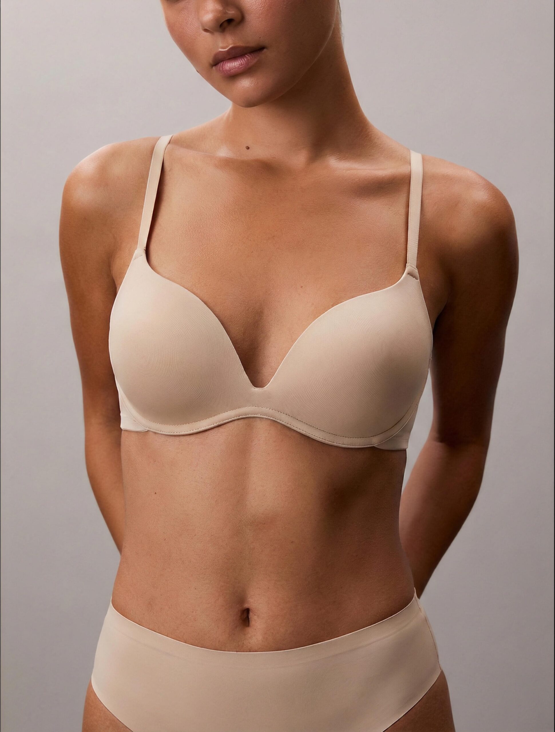 Le coppe preformate assicurano un sostegno delicato e una forma armoniosa, senza alterare il décolleté. La tecnologia di termoformatura riduce al minimo le cuciture, offrendo un finish essenziale e moderno, senza segni sulla pelle né punti di pressione.
