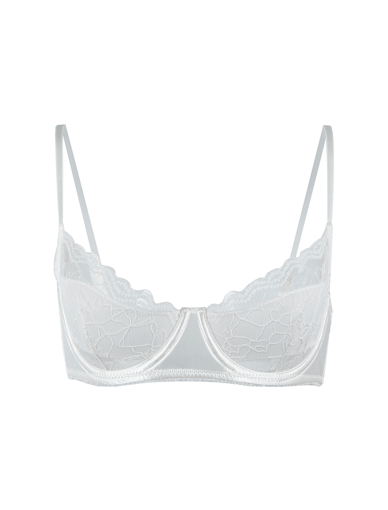 Un reggiseno che unisce la raffinatezza del pizzo floreale bianco alla lucentezza del raso. Con ferretto per un supporto ottimale e coppe per un effetto seducente e un décolleté valorizzato.