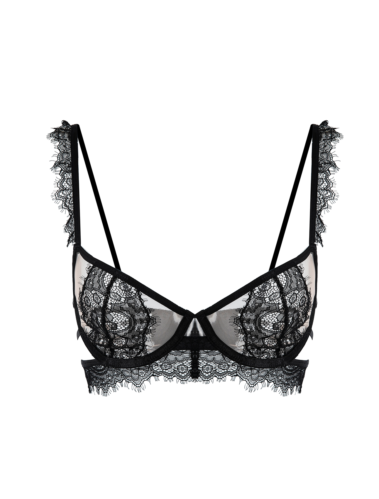Reggiseno nero in pizzo floreale, con ferretto e senza imbottitura, caratterizzato da un design a balconcino con dettagli cut-out e spalline sfrangiate in pizzo.