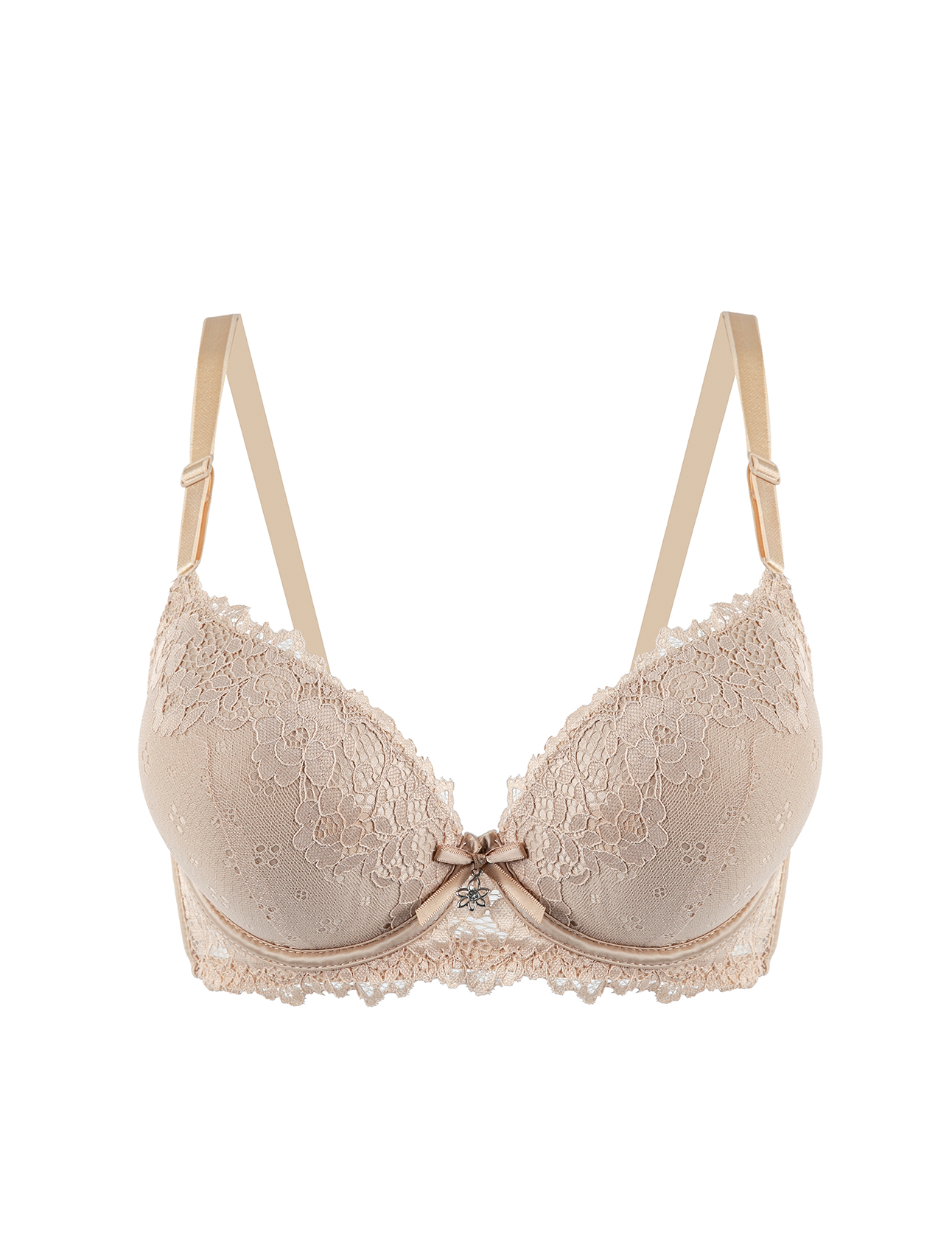 Un reggiseno push-up in un’elegante tonalità beige con un’intricata sovrapposizione in pizzo floreale. Questo modello con ferretto presenta coppe imbottite per un effetto volume e sollevamento ottimale. Le spalline sono regolabili per una vestibilità personalizzata, e un piccolo ciondolo decorativo adorna il centro del capo. È l’ideale per l’uso quotidiano, combinando comfort e sensualità.