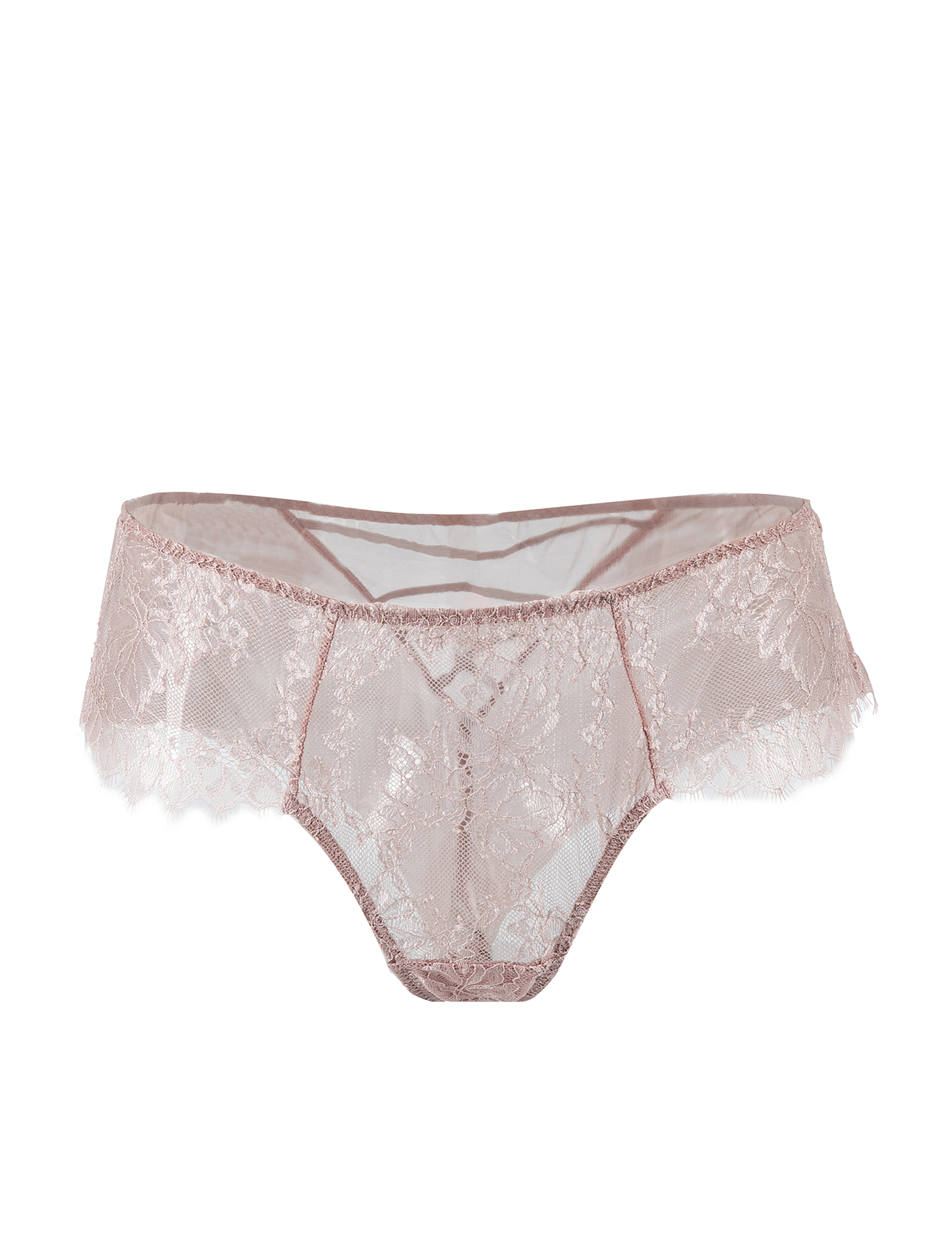 Slip culotte in elegante pizzo floreale color rosa cipria. Caratterizzati da una comoda vestibilità a vita media e fianchi alti, offrono una copertura media e un effetto invisibile sotto i vestiti grazie al tessuto elasticizzato e ai bordi in pizzo. Un capo femminile e versatile, perfetto per il comfort quotidiano con un tocco di sensualità.