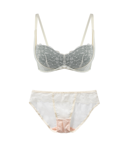 Wireless Floral Lace & Sheer Mesh Lingerie Set – Pearl Grey & Ivory